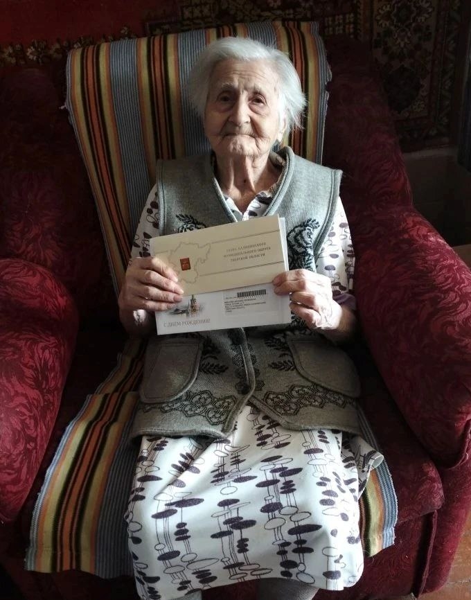 Имениннице были вручены правительственная телеграмма, в которой выражается глубокая благодарность за её самоотверженный труд и вклад в защиту Родины, а также поздравительное письмо от главы Калининского округа.